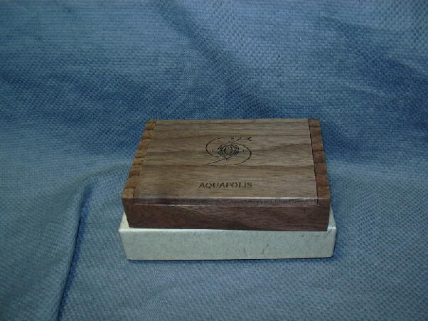 | 木製ケースの表面です。イングラム社マークとAQUAPOLISのと名称が刻印され、逸品の名に恥じない仕上げです。 |